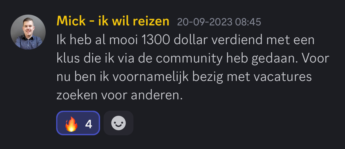 "Eergisteren lid geworden van de Discord, en vandaag de job voor appointment setter binnen gesleept! 💪🏻🤩Letsgo"